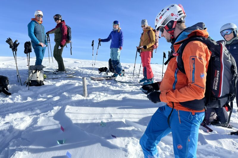 Teilnehmer des Skitouren-, Freeride- und Skitechnik-Kurses beim Lernspiel zur Lawinengefahr-Bewertung. -
