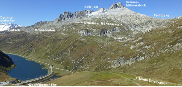 Aufstieg vom Oberalppass zur Fellilücke, danach zum querend zum Panorama-Restaurant und auf dem Höhenweg vorbei am Lutersee zum Ausgangspunkt Nätschen