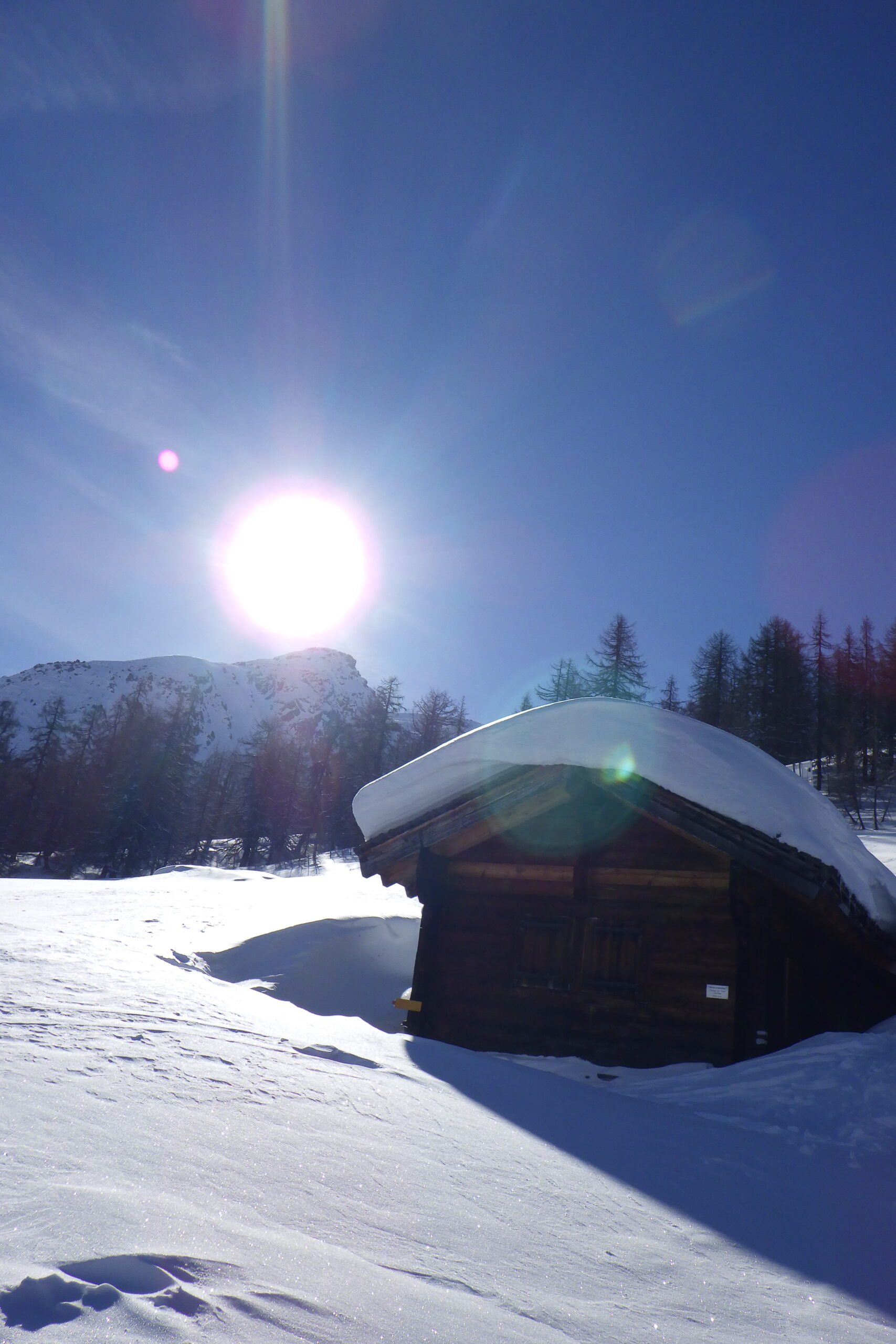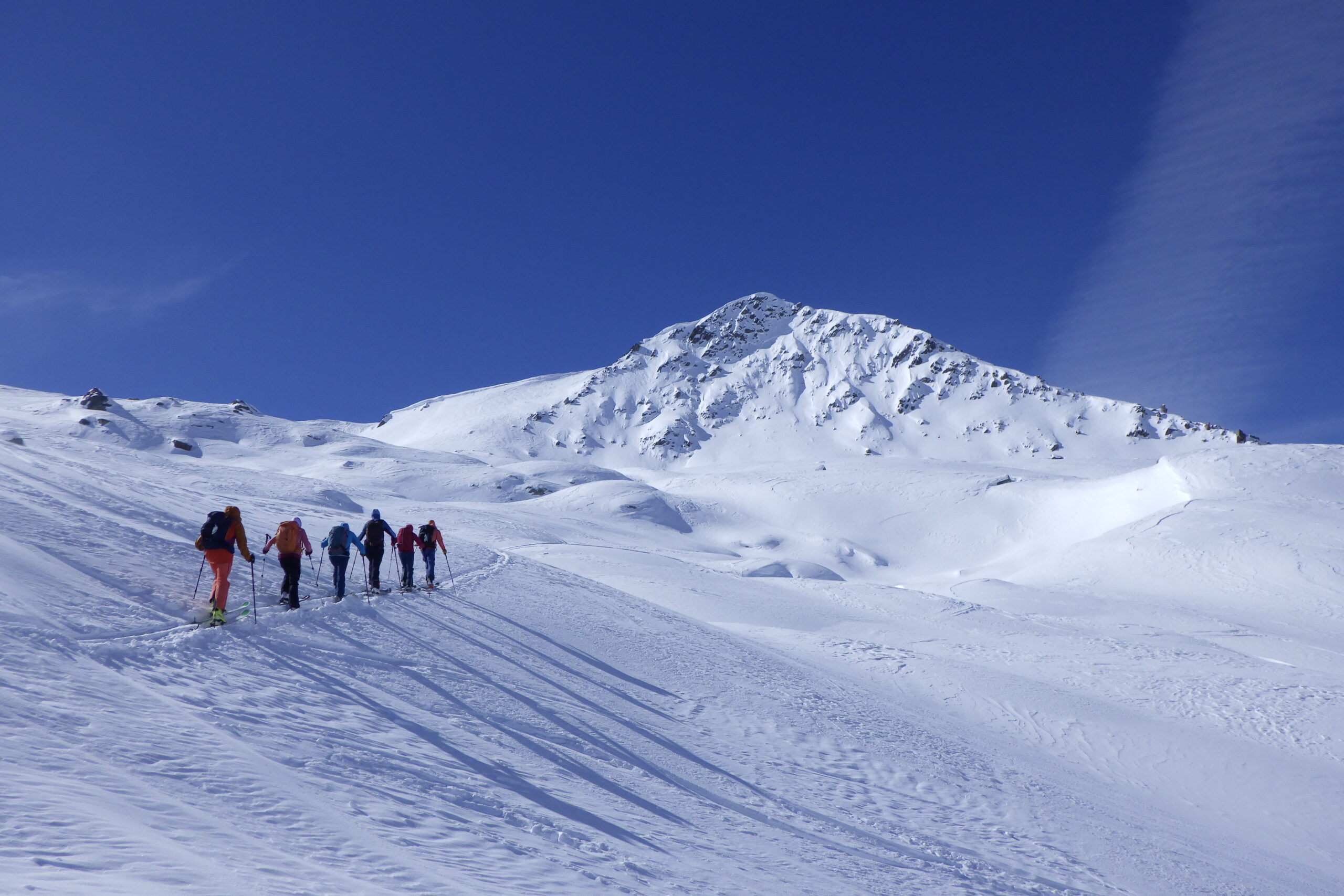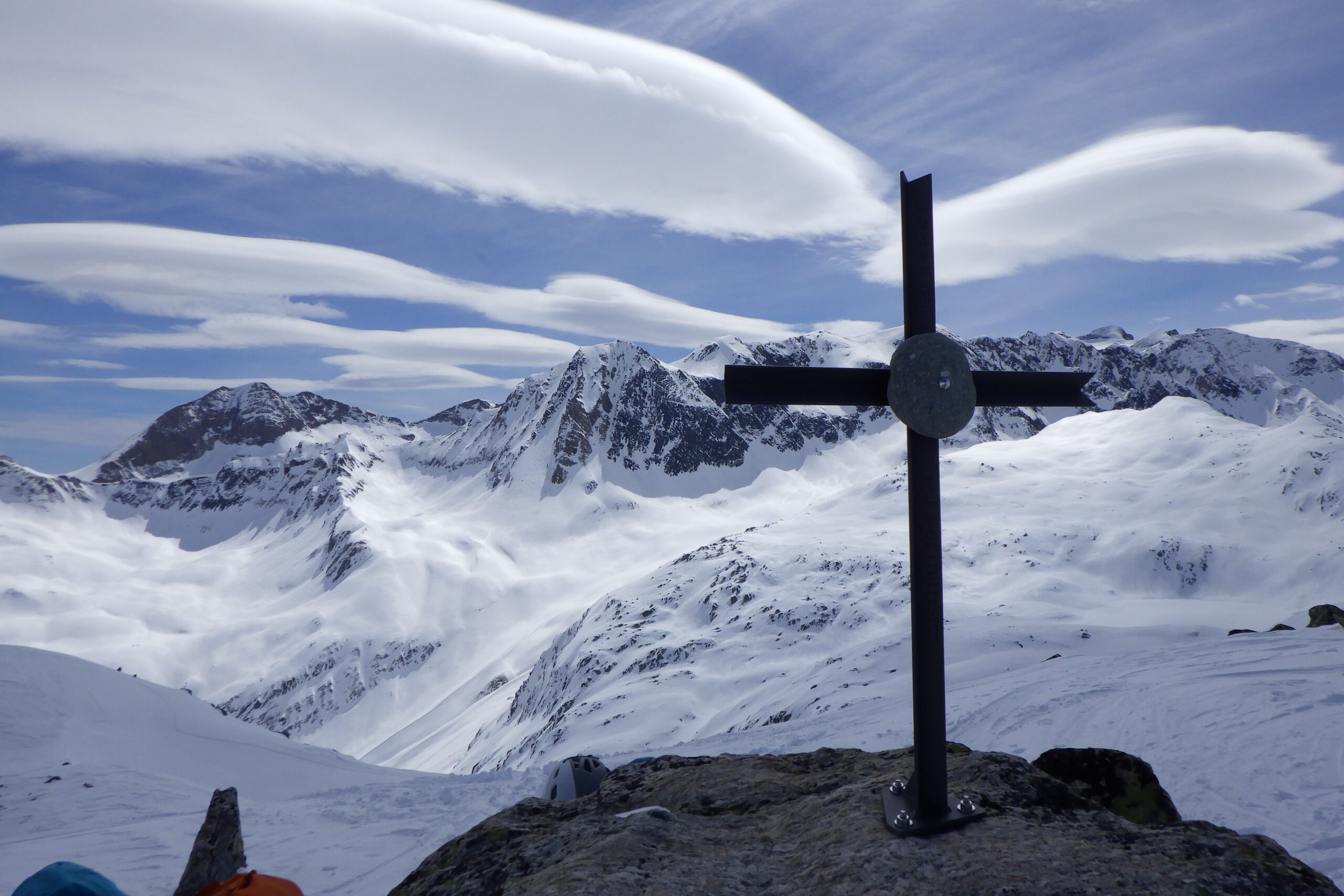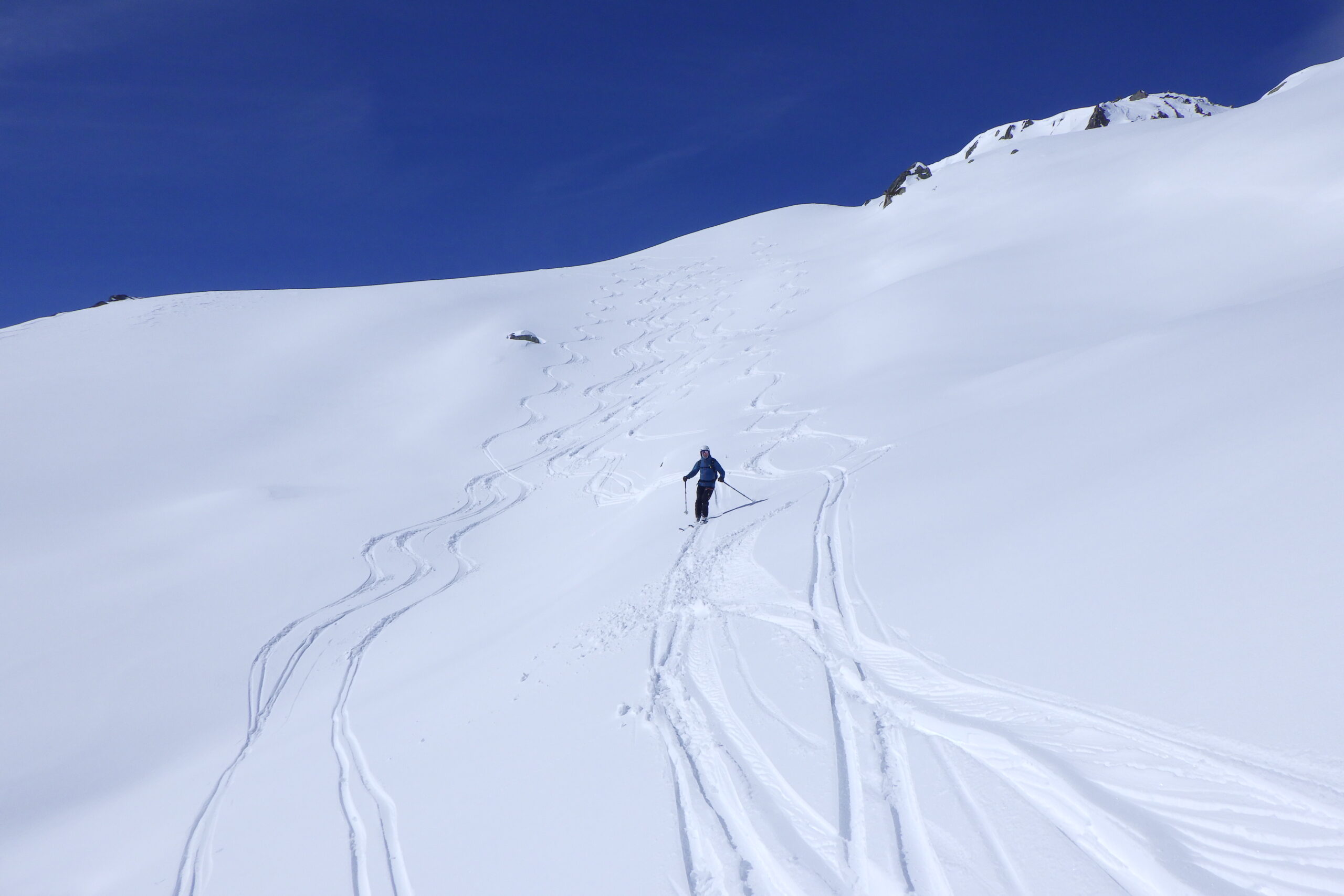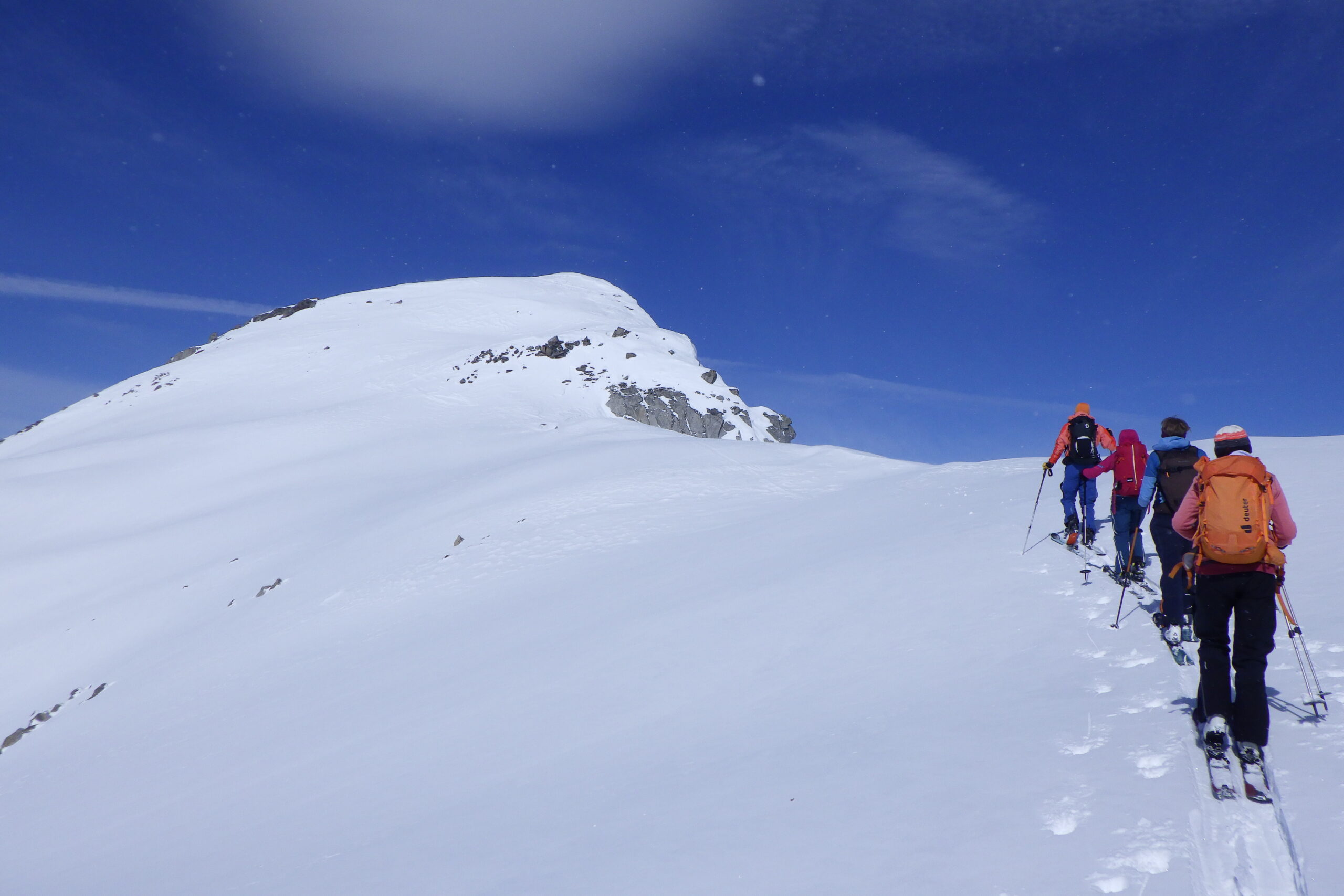 Es folgte ein kurze aber von frischem Pulver geprägte Abfahrt südlich des Grades, wo wir an einem Windgeschützten, sonnigen Felsen unsere Mittagspause hatten.