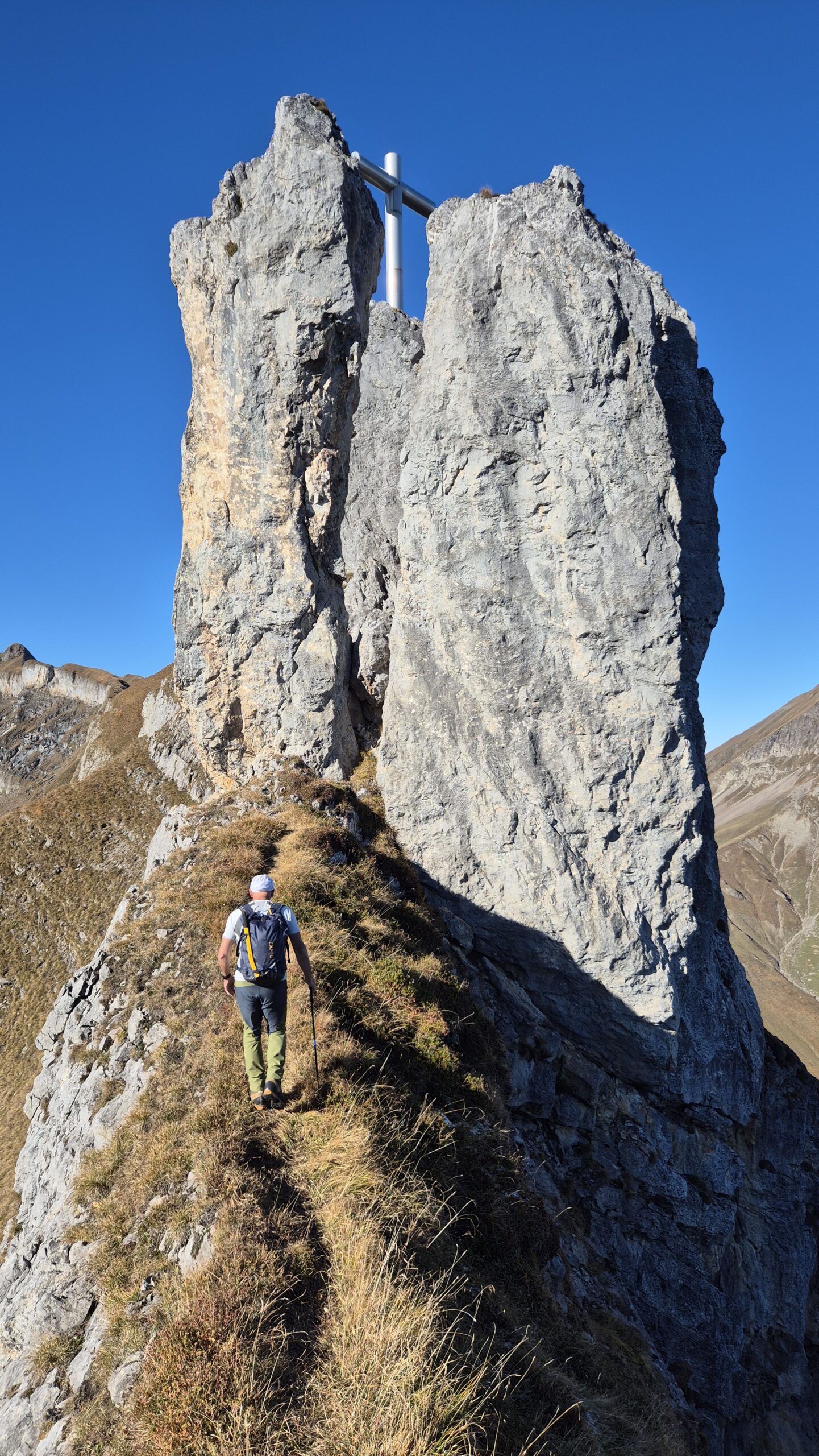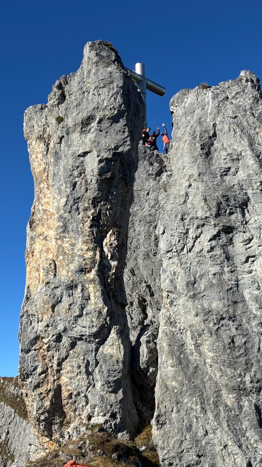 Nach der kurzen Rast gings weiter zum «Stockzahnd» einer spektakulären Kalksteinsäule mitten auf dem Grat. Im Laufe der Jahrtausende wurde dieser Zahn von Karies befallen – er ist voll von Rissen und brüchigen Steinen, weshalb wir uns in zwei Gruppen an unsere SAC-Wurzelbehandlung machten. Ausgerüstet mit Gstältli und Klettersteigset bestiegen alle 10 Tourteilnehmenden den Kalkpfeiler und bestaunten das kolossale Gipfelkreuz, das sogar dem Rophaien Konkurrenz macht. Notiz an jene die als nächstes dem Oberalpergrat auf den Stockzahn fühlen wollen: nehmt ein neues Gipfelbuch mit, das alte ist schon flätt verfault.