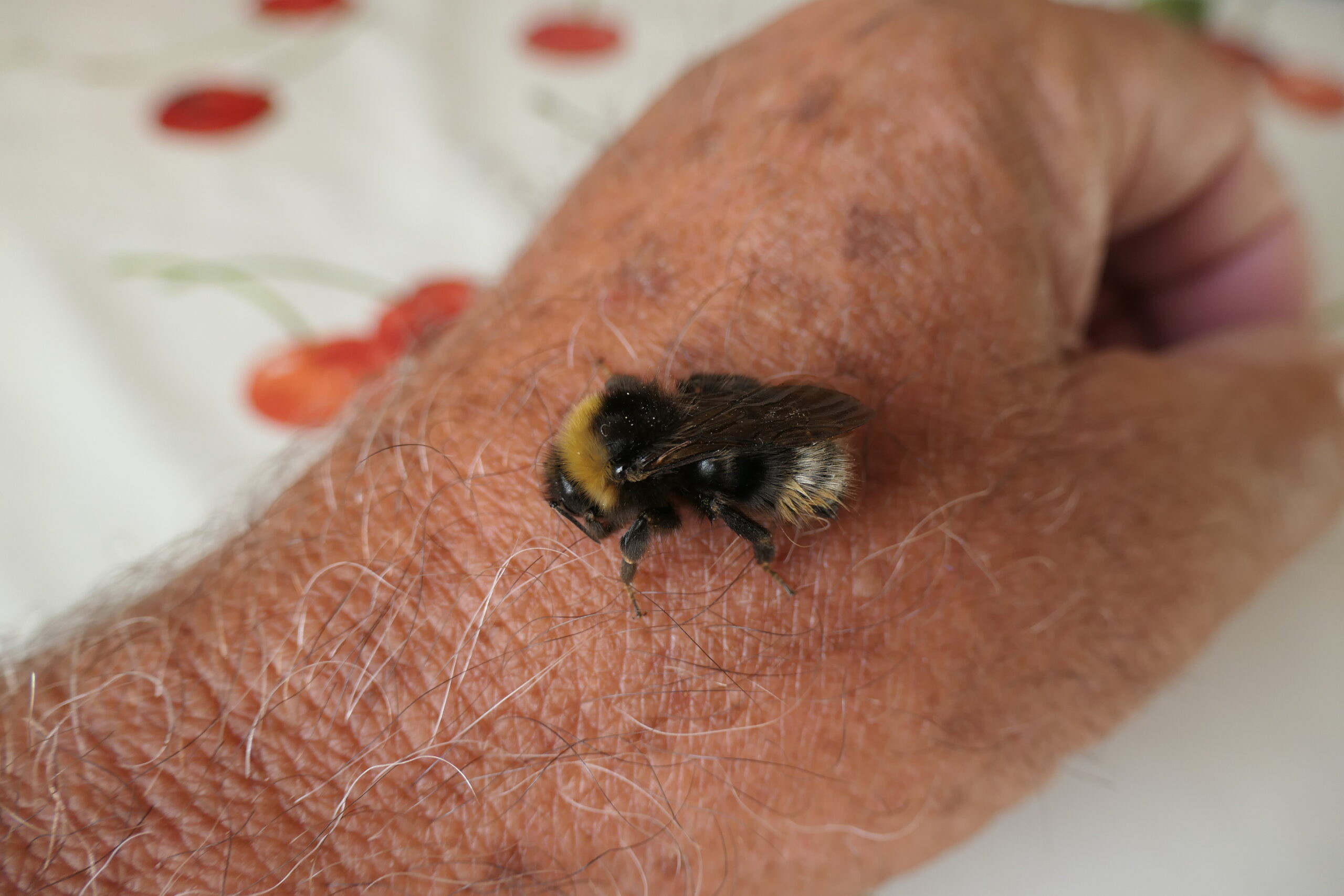 Während ich auf der Terrasse das Wetter studierte - „hüt isch nid leid“ - landet eine erschöpfte Erdhummel auf meiner linken Hand. Beim genaueren Betrachten handelt es sich um eine Arbeiterin, könnte aber auch eine Königin sein. Zuckerwasser mag sie nicht, dafür etwas Schweiss von meiner Haut. Ich hatte noch etwas Zeit zum Googeln - was das wohl bedeuten mag. Was ich da las lässt meinen Pulsschlag erhöhen.