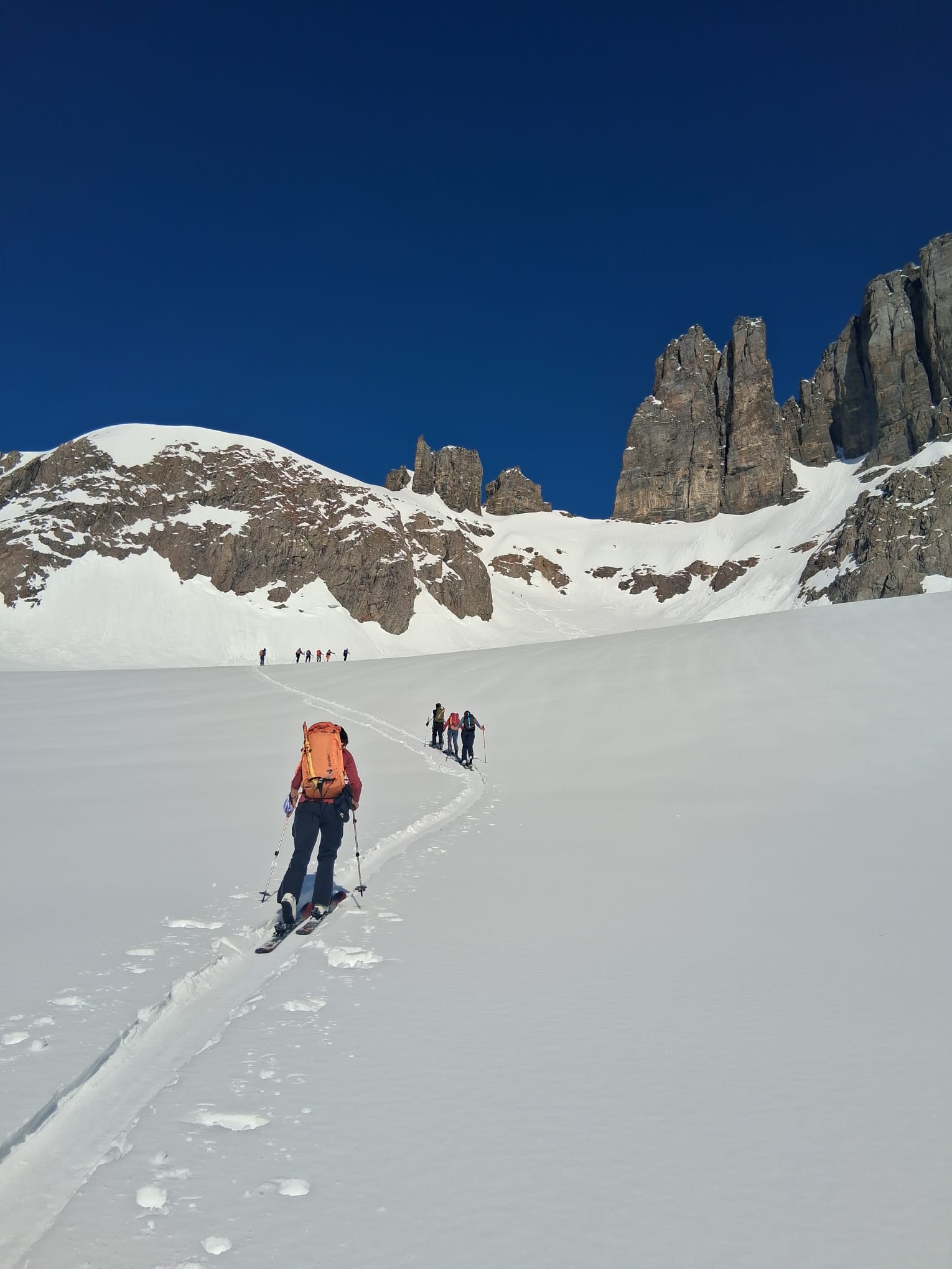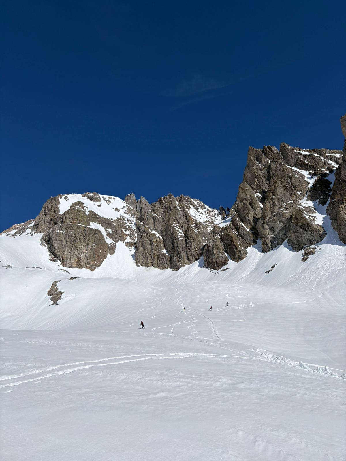 Im Meiental wird kurz vor Goretzmettlen parkiert, die Skier montiert und los geht’s. Der stahlblaue Himmel über uns verspricht eine schöne Skitour und wir waren daher nicht die Einzigen. Erst geht es flach dem Bach entlang, doch ab Rossplangg steigt es mehr und wir gewinnen auf dem griffigen Schnee schnell an Höhe. Auf dem Rossfirn geht der Blick zum eindrücklichen Wintertürmli hoch und man fragt sich, wie man da wohl hochkommt. Bald ist das Skidepot erreicht, wo die Steigeisen montiert werden. Im guten Trittschnee geht es das Couloir hoch und schon geniessen wir die herrliche Aussicht.